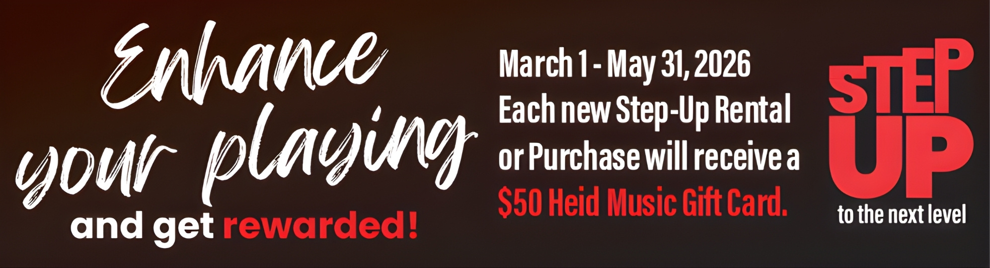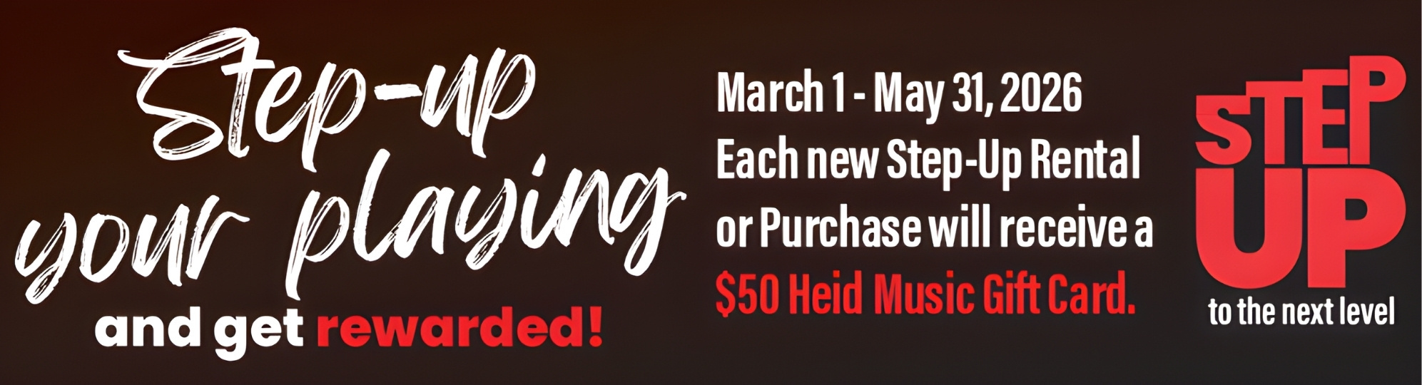 Qualifying instruments include step-up band and orchestra instruments such as flutes, clarinets, saxophones, trumpets, trombones, French horns, violins, violas, cellos, and more. Visit any Heid Music location or contact us for specific model recommendations.