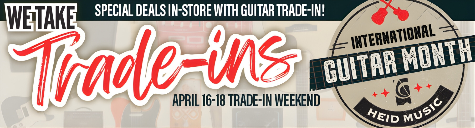 Visit any Heid Music location April 16–18 with the guitar (or guitars) you'd like to trade. Any brand, any condition — we'll take a look.